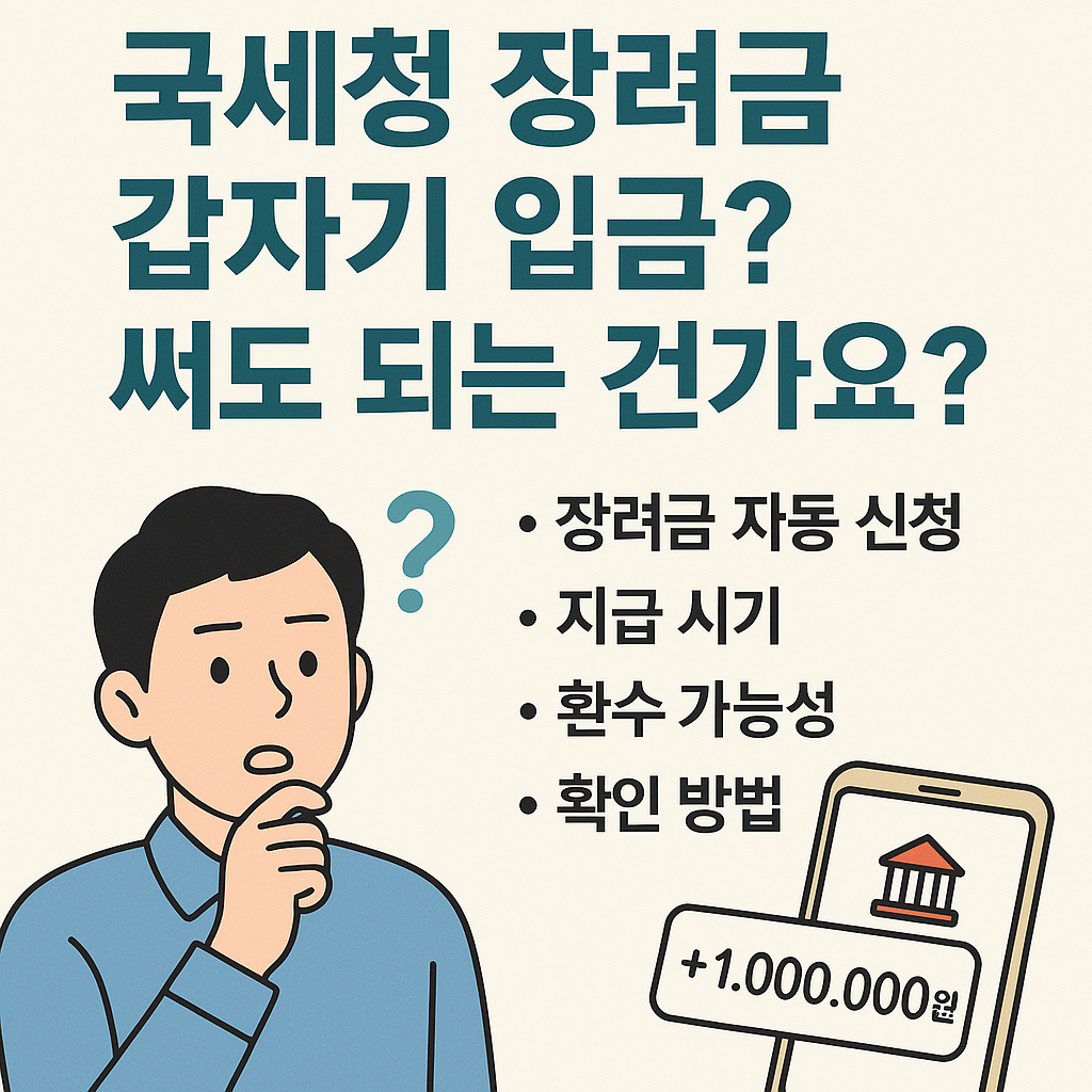 국세청 장려금이 신청도 안 했는데 갑자기 입금되셨나요? 근로·자녀장려금의 자동신청 제도, 지급 시기, 환수 가능성, 확인 방법, 상담처까지 종합 정리했습니다. 안심하고 확인하세요.