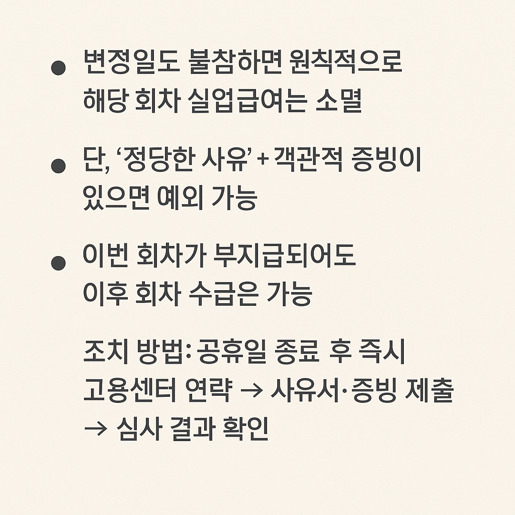 - 원칙: 변경한 날짜에도 불참하면 해당 회차 실업급여 부지급
