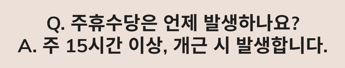 - 주휴수당은 주 15시간 이상 근무하고, 결근 없이 근무한 경우 발생합니다.