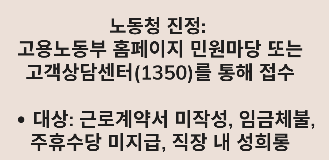 - 노동청 진정: 고용노동부 홈페이지 민원마당 또는 고객상담센터(1350)를 통해 접수