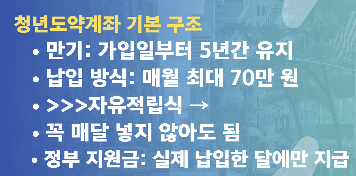 - 납입 방식: 매월 최대 70만 원, 자유적립식 → 꼭 매달 넣지 않아도 됨