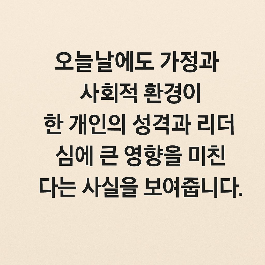 👉 이는 오늘날에도 가정과 사회적 환경이 한 개인의 성격과 리더십에 큰 영향을 미친다는 사실을 보여줍니다.