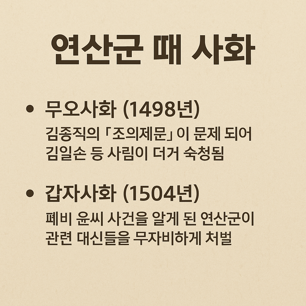 - 무오사화(1498년): 김종직의 「조의제문」이 문제 되어 김일손 등 사림이 대거 숙청됨