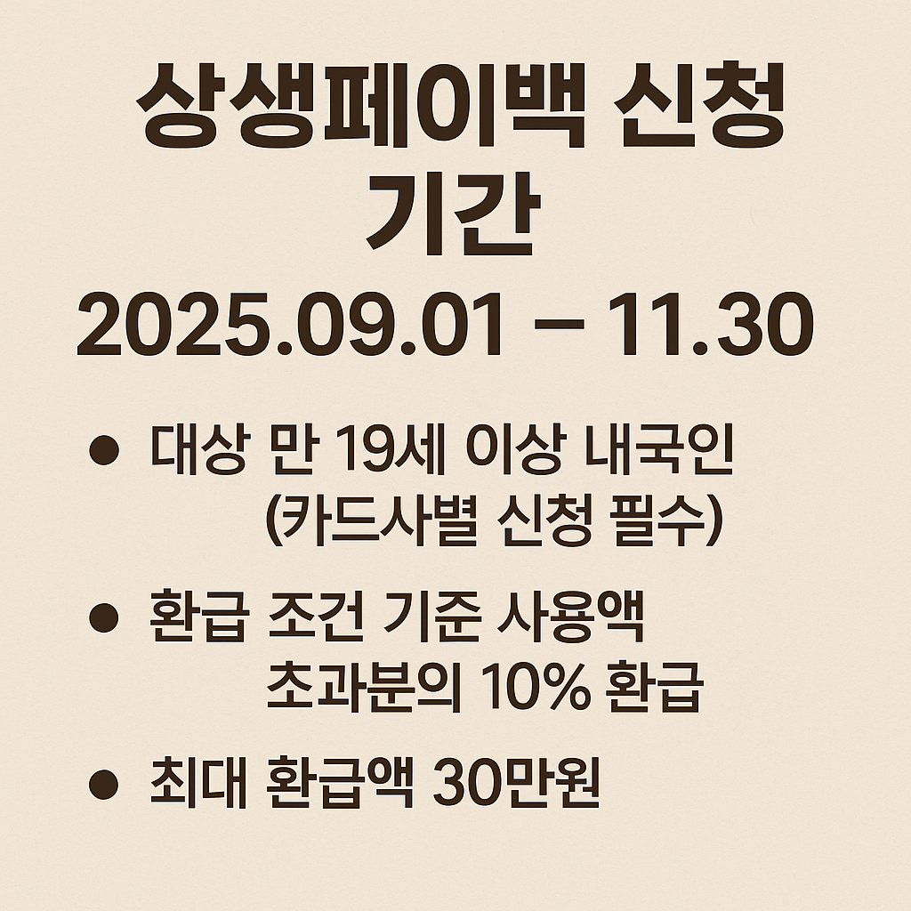 2025년 상생페이백 정책은 일정 금액 이상 사용 시 최대 30만 원까지 환급받을 수 있는 정부 지원 소비 혜택입니다. 신청 조건, 절차, 환급 금액, 사용처, 카드사별 차이와 환급 계산 예시까지 한 번에 정리했습니다.