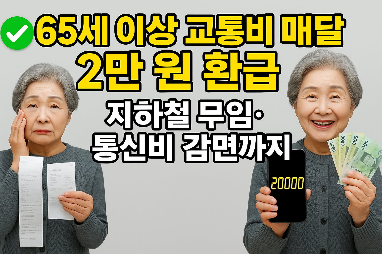 65세 이상이라면 반드시 챙겨야 할 세 가지 혜택은 교통비 환급, 지하철 무임, 통신비 감면입니다.
