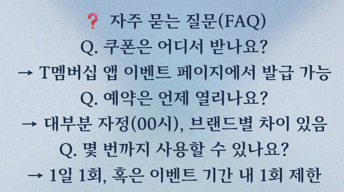 하지만 단순히 “쿠폰 받으면 된다” 수준이 아니라, 예약 시간·요일·멤버십 등급 조건까지 꼼꼼히 챙겨야 제대로 혜택을 누릴 수 있습니다. 이번 글에서는 9월 SKT 고객 감사제의 **브랜드별 혜택, 예약 꿀팁, 실사용 후기, 자주 묻는 질문(FAQ)**까지 모두 정리해 드릴게요.