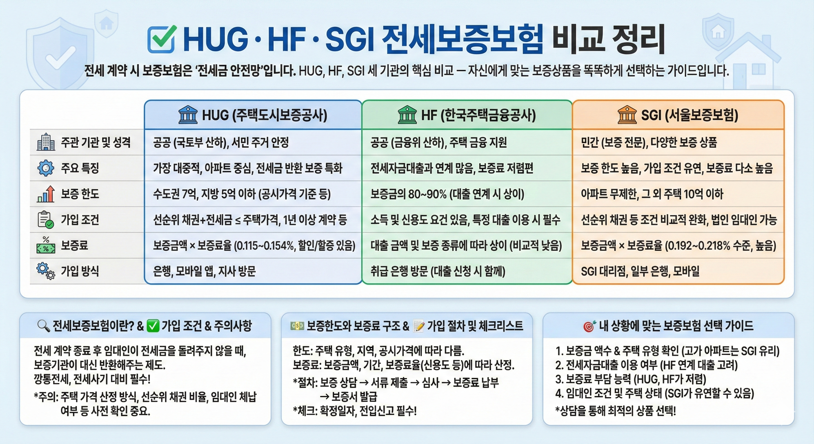 HUG, HF, SGI 세 기관의 보증한도·가입 조건·보증료·가입 방식 등 핵심을 비교 —