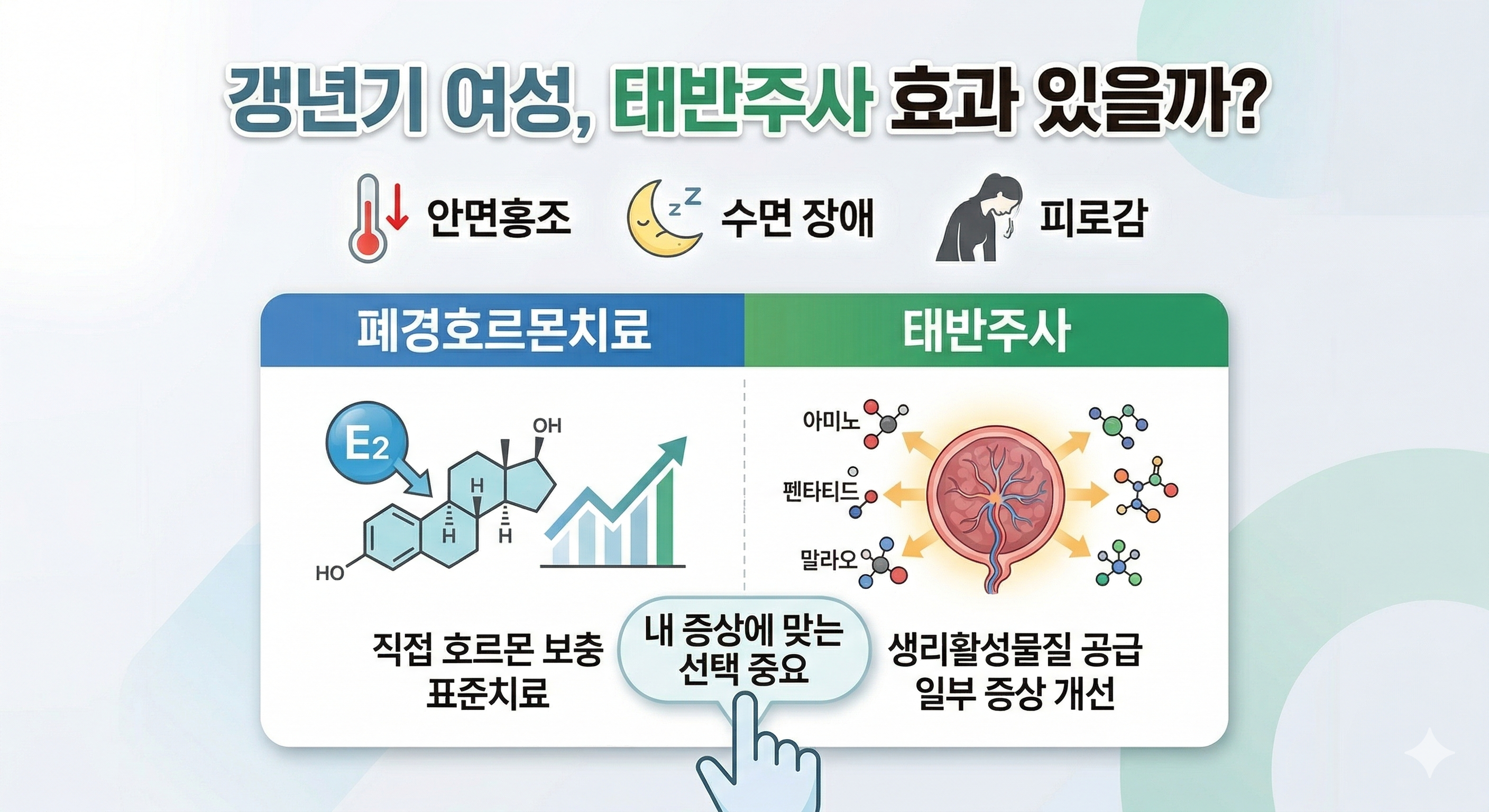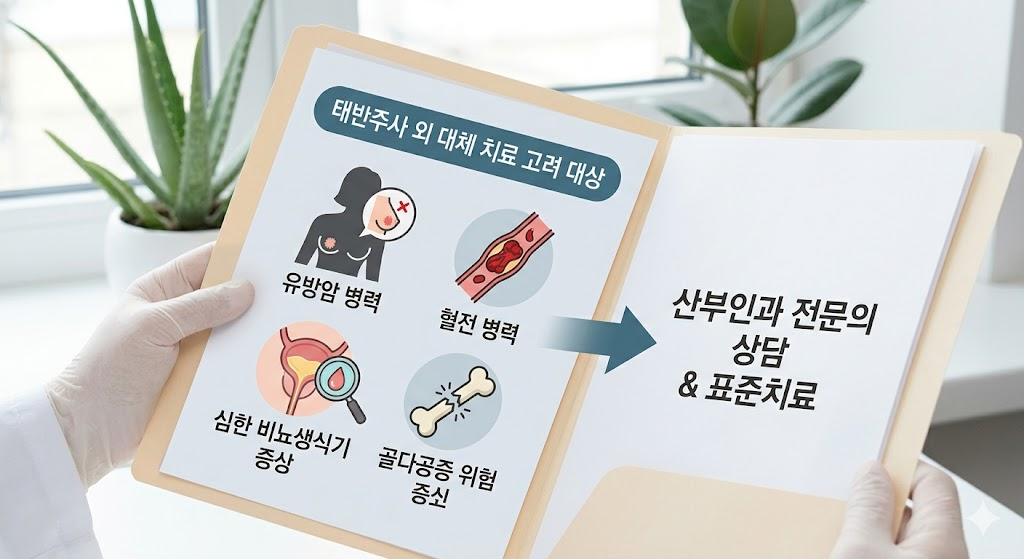 가이드라인에서는 원인 미상의 질출혈, 유방암 같은 에스트로겐 의존성 암, 혈전색전질환, 간질환, 담낭질환 등이 있으면 매우 신중히 판단해야 한다고 설명합니다. 그래서 실제 진료에서는 “태반주사가 좋냐, 호르몬이 좋냐”가 아니라, 현재 증상과 병력에 맞는 치료가 무엇이냐를 먼저 따집니다.