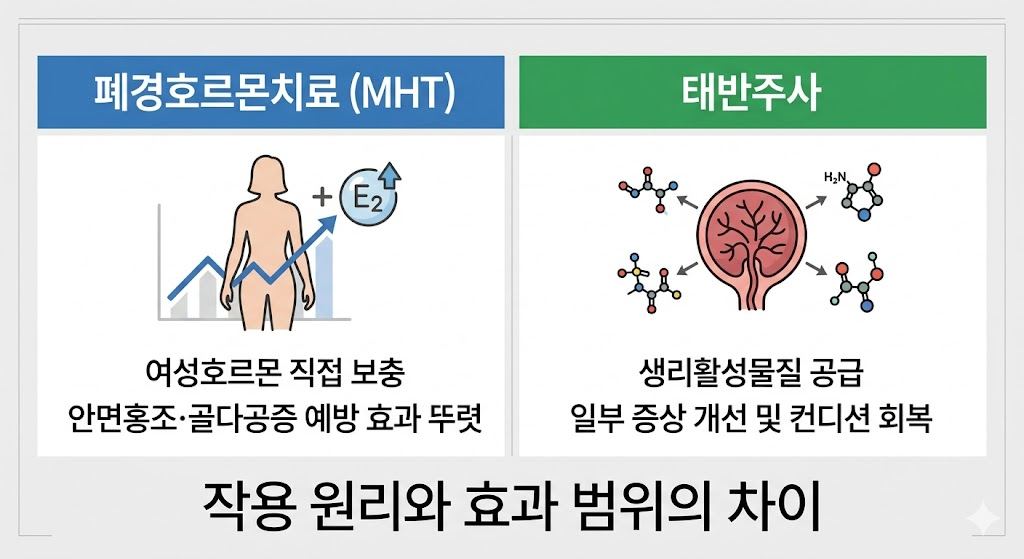 태반주사는 여성호르몬을 직접 보충하는 치료가 아닙니다. 폐경 후 감소한 에스트로겐을 채워 넣는 방식이 아니기 때문에, 폐경호르몬치료와는 전혀 다른 범주로 이해하셔야 합니다. “둘 다 갱년기에 쓴다”는 점은 비슷하지만, 치료의 기본 원리 자체가 다르다는 점이 핵심입니다.