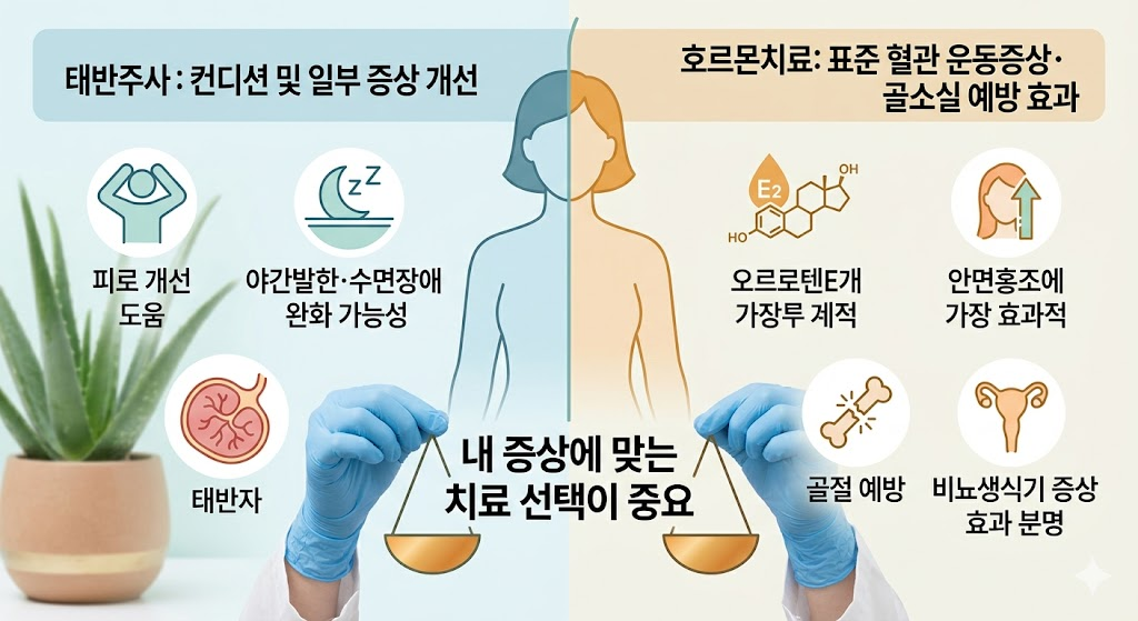 특히 중요한 점은, 질건조, 성교통, 배뇨 불편 같은 비뇨생식기 증상이나 폐경 후 골손실 예방까지 기대하는 경우라면 태반주사보다 호르몬치료 쪽 근거가 훨씬 분명하다는 것입니다. 이 부분은 치료 선택에서 꽤 중요한 차이입니다.