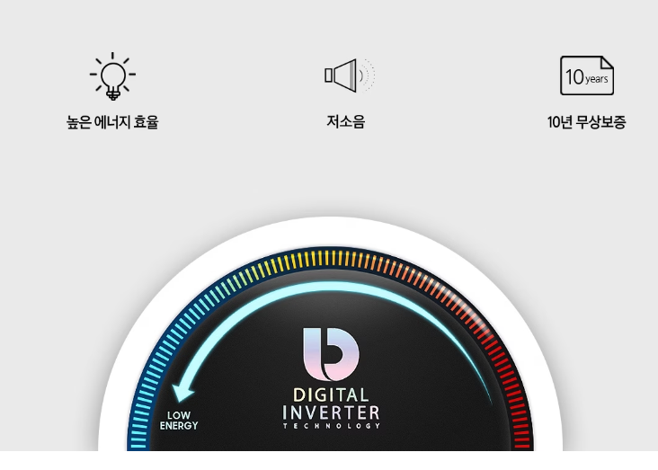 2️⃣소음이 적고 에너지 낭비걱정이 없는 디지털 인버터 컴프레서 기능을 장착하고 있습니다. 이 기능은 10년 무상보증혜택을 제공하고 있습니다.
