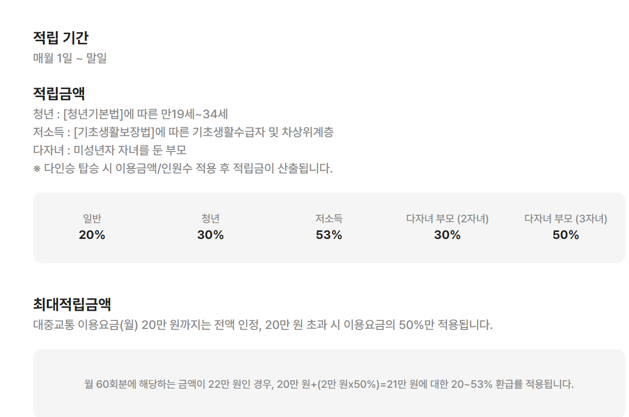 - 이용 횟수 조건: 월 15회 이상 대중교통을 이용해야 환급 혜택이 적용됩니다.