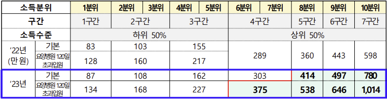 소득의 하위 5 분위까지는 기존보다 4만 원에서 10만 원 정도씩 부담금 상한선이 올라가는데 비해서,