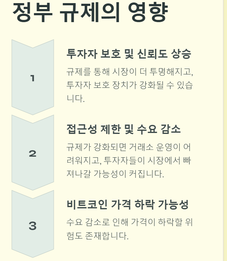 접근성 제한 및 수요 감소: 규제가 강화되면 거래소 운영이 어려워지고, 투자자들이 시장에서 빠져나갈 가능성이 커져요.