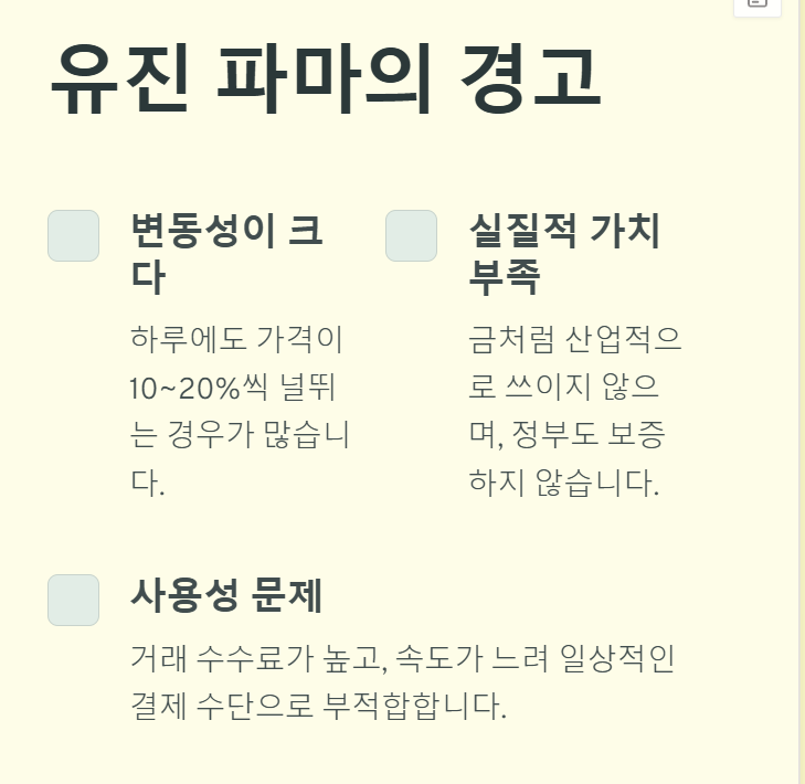 ✅ 실질적인 가치 부족: 금처럼 산업적으로 쓰이지 않으며, 정부도 보증하지 않아요.