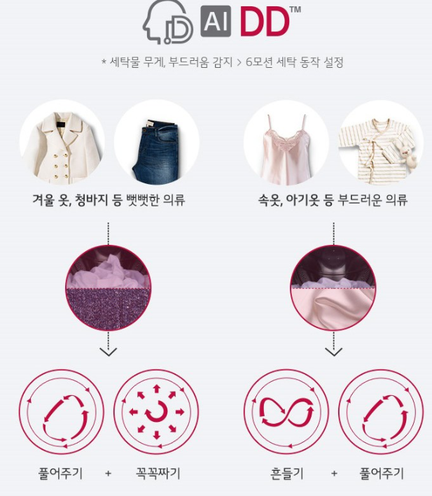◾인공지능 DD가 세탁물의 종류와 무게를 감지, LG만의 6 모션 중 세탁물에 맞는 모션과 세탁 패턴,