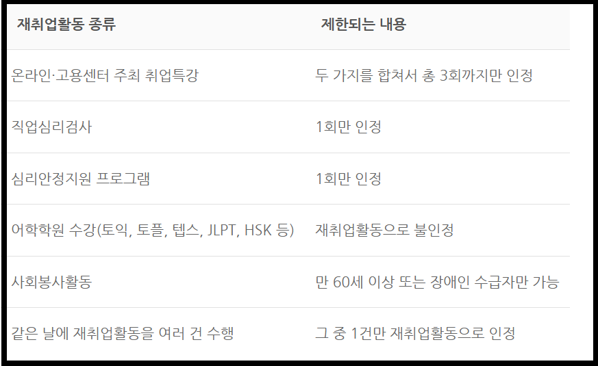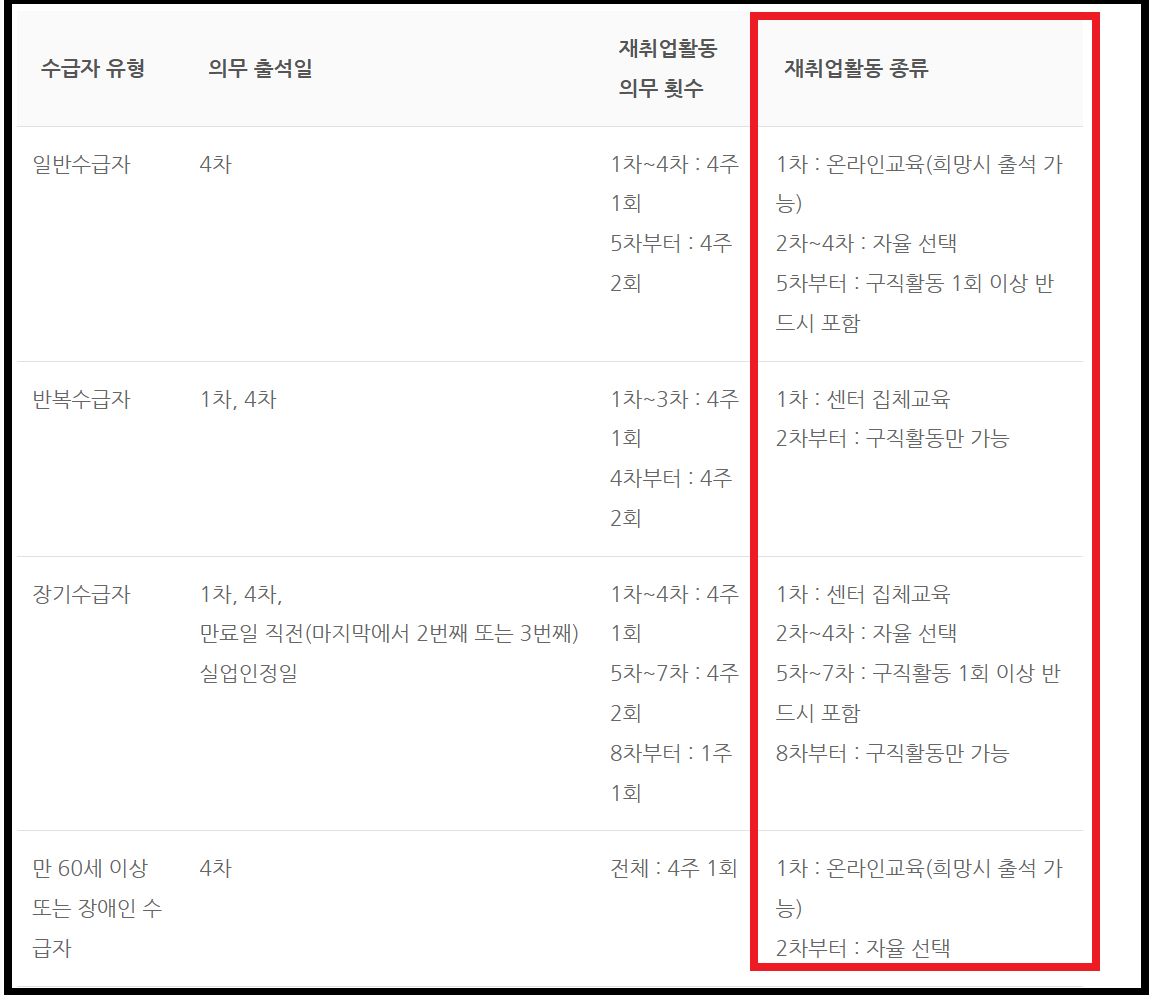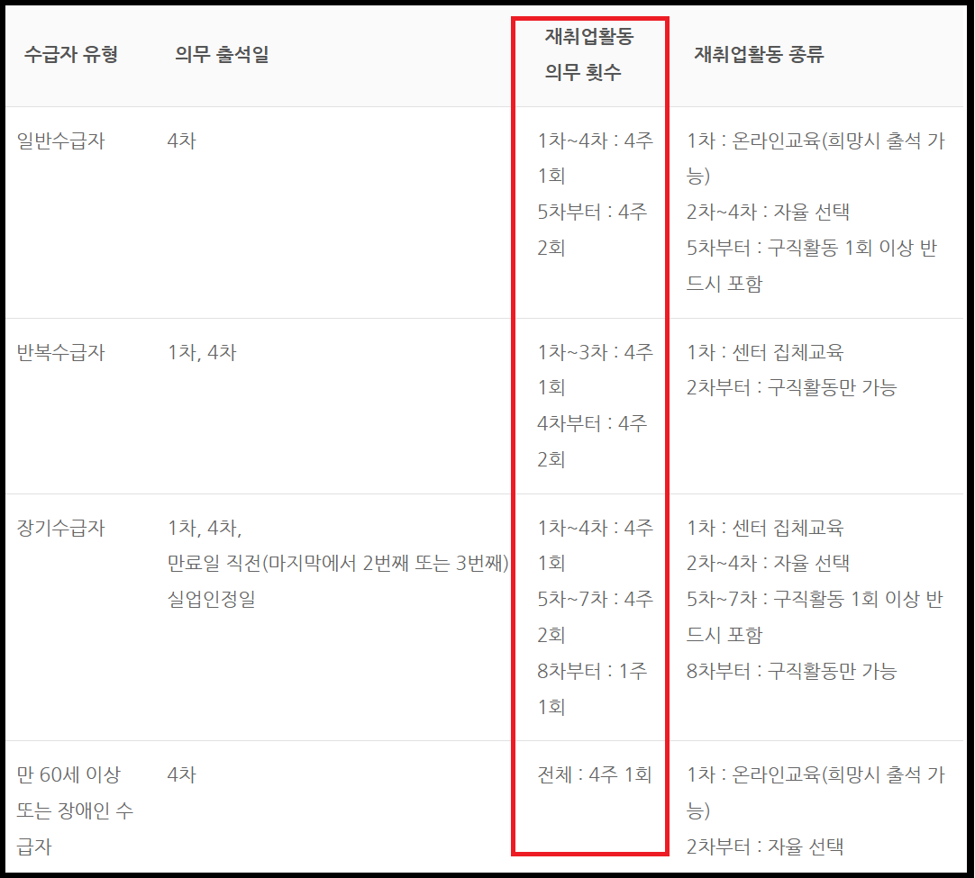 특히 반복수급자의 경우에 장기간 반복적으로 수급하는 경우를 방지하기 위해서, 1-3차까지는 4주에 1회 재취업활동을 하고, 4차부터는 4주에 2회의 재취업활동을 하도록 개편되었습니다.