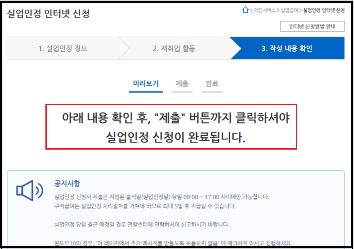 •마지막으로 작성내용 확인단계로 넘어갑니다. 지금까지 작성한 사항을 꼼꼼히 확인한 후 반드시 제출버튼을 눌러야 실업인정 신청이 완료되며, 실업인정일 '당일오전'에 고용보험 홈페이지에 로그인해서 임시저장해 둔 내용을 제출클릭해야 합니다. 제출을 완료하면 실업인정내역이 나옵니다. 실업인정일수, 지급액, 다음 실업인정일 등을 확인합니다. 실업인정신청서 전송이 잘 되었는지 ' 나의 민원현황'을 조회해 보기 바랍니다. 제출에 성공하면 바로 알림톡이 오고 보통 다음날 실업급여가 입금됩니다.