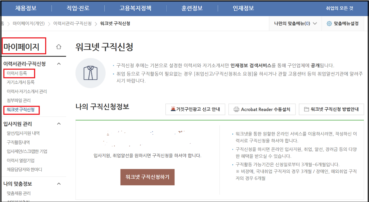'워크넷'에 접속해서, 마이페이지>> 이력서등록>> 이력서 작성하기/ 자기소개서는 선택사항입니다. >> 워크넷 구직신청 >> 절차대로 진행해서 워크넷구직번호가 나오면 구직신청이 완료됩니다.