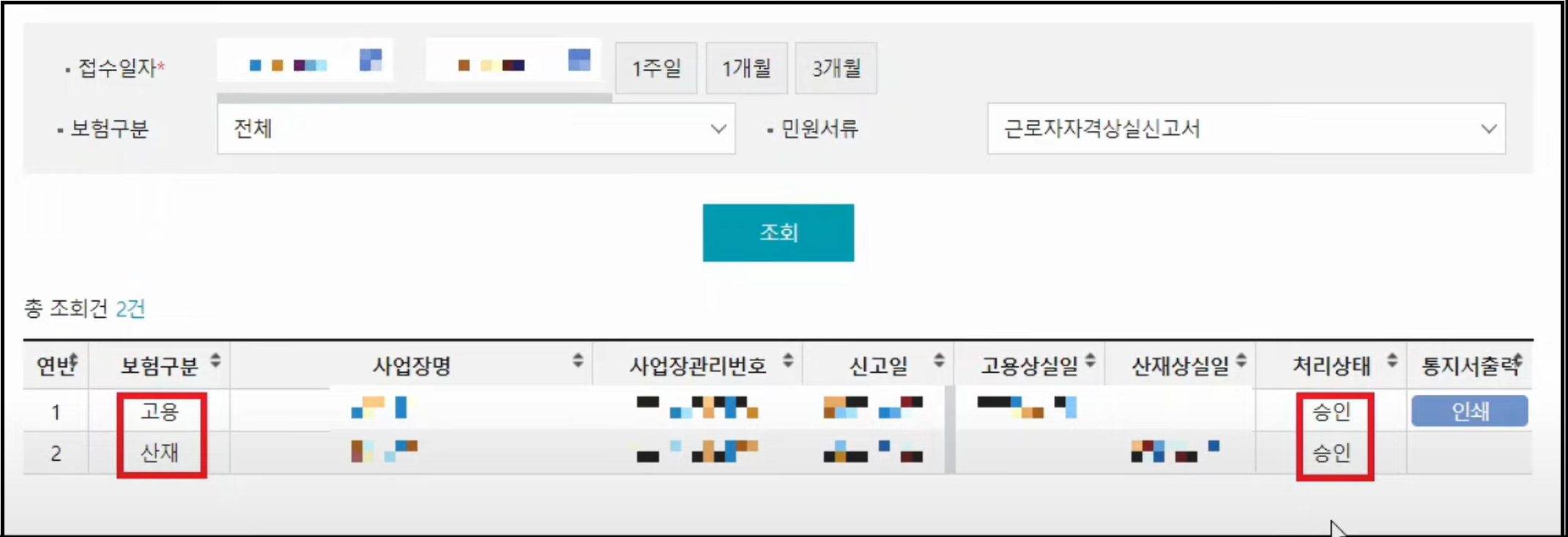 고용보험, 산재보험의 가입신고와 상실 등의 처리상태가 승인으로 되어있는지 확인합니다.