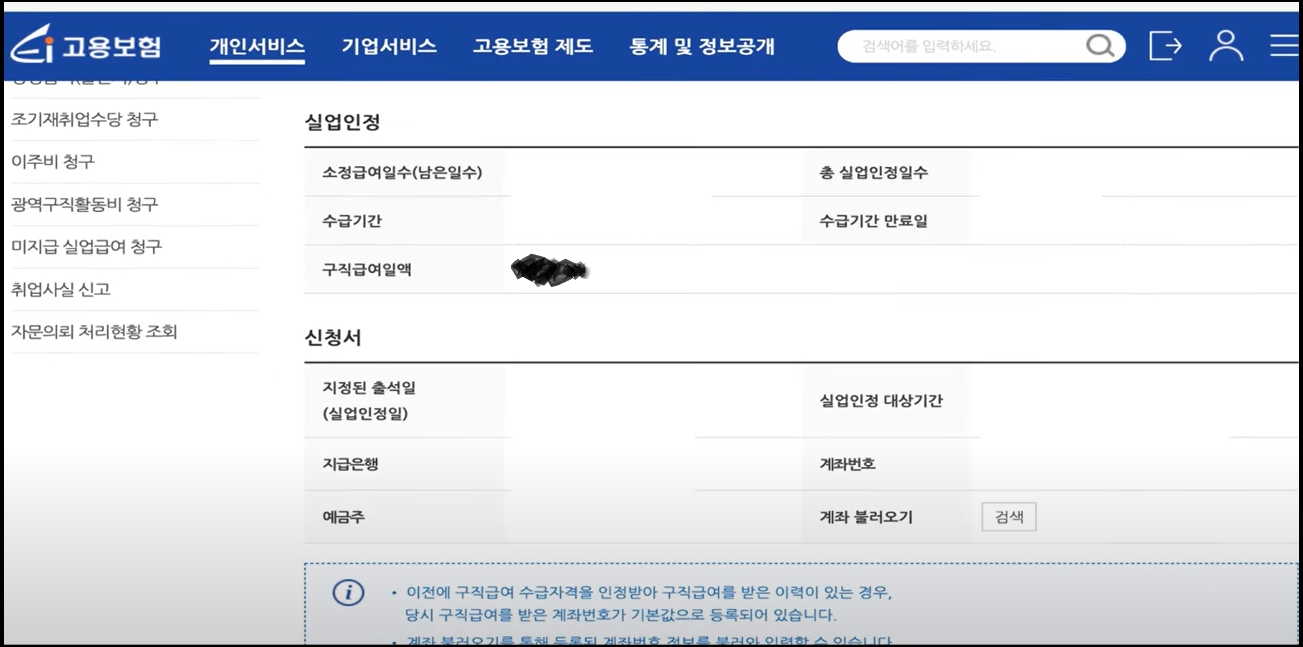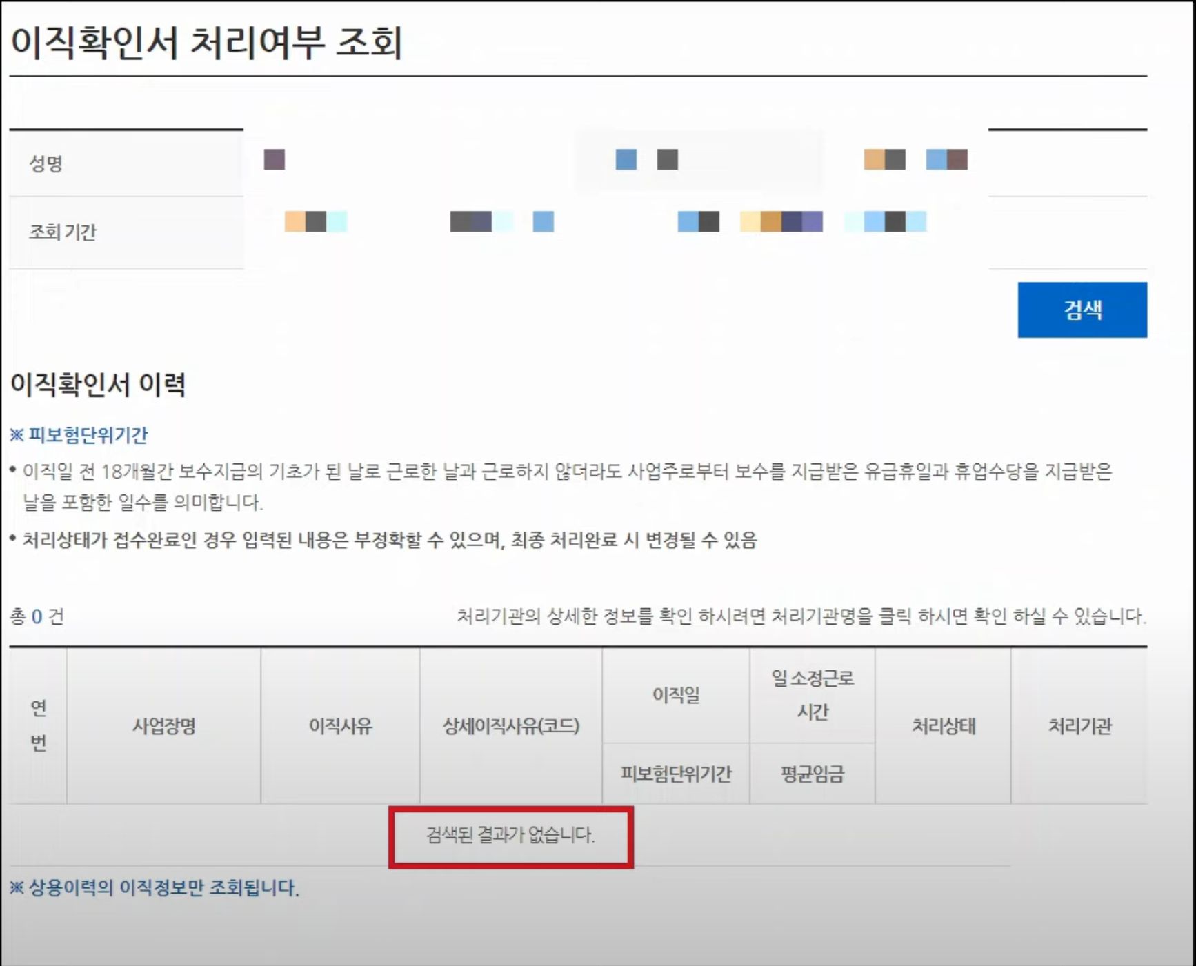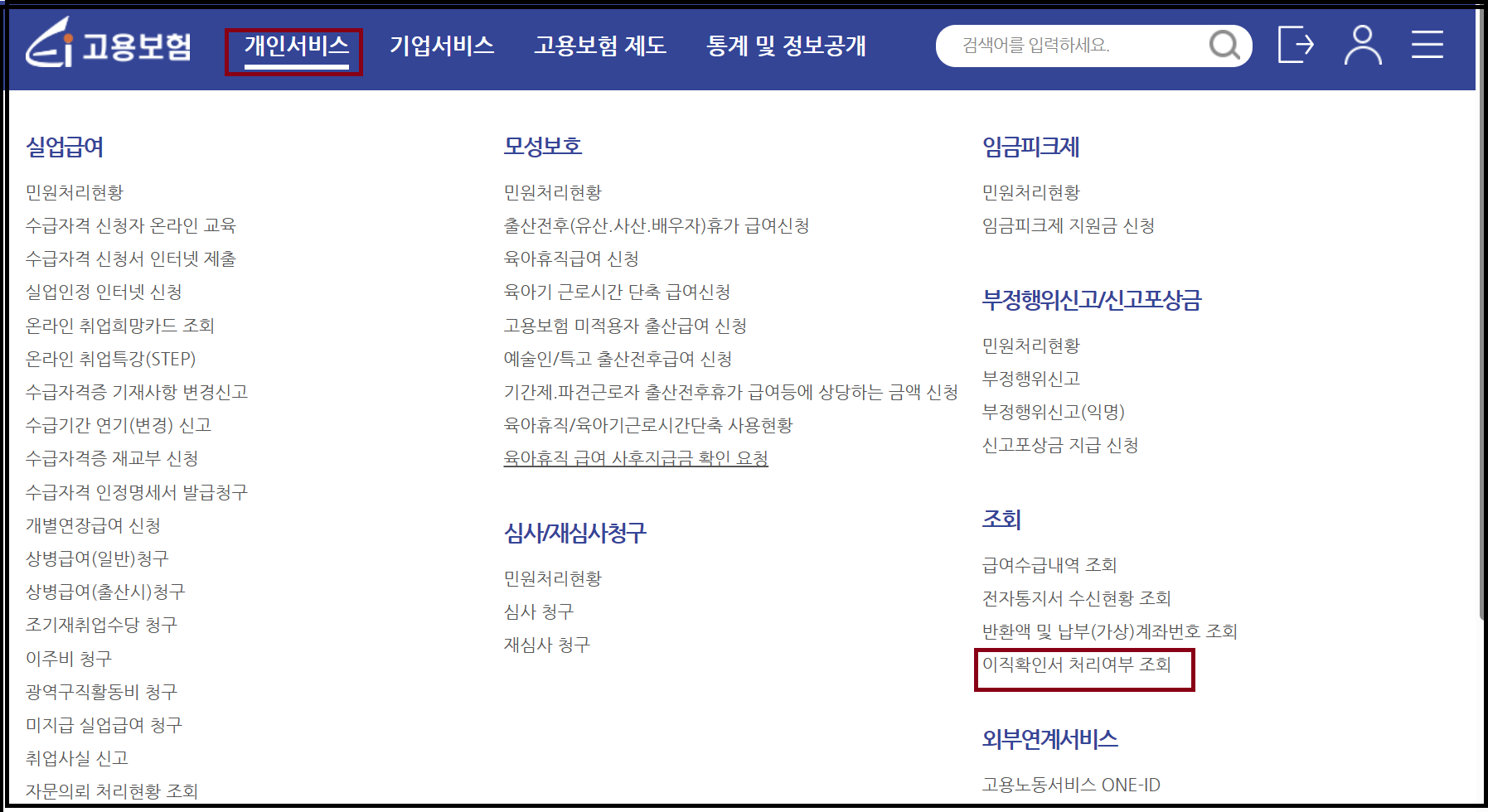 개인서비스 >> 이직확인서처리여부 조회>> 검색을 클릭합니다. 검색결과가 없다면 실업급여를 신청할 수 없으므로 회사에 연락해서 이직확인처리해 줄 것을 요청합니다.