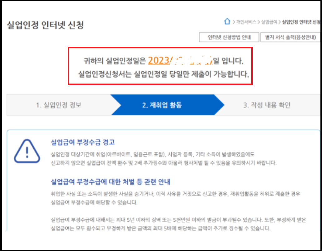 2. 재취업활동인 '1차 실업인정교육'을 제출하기 전에 실업인정일을 확인하시기 바랍니다.