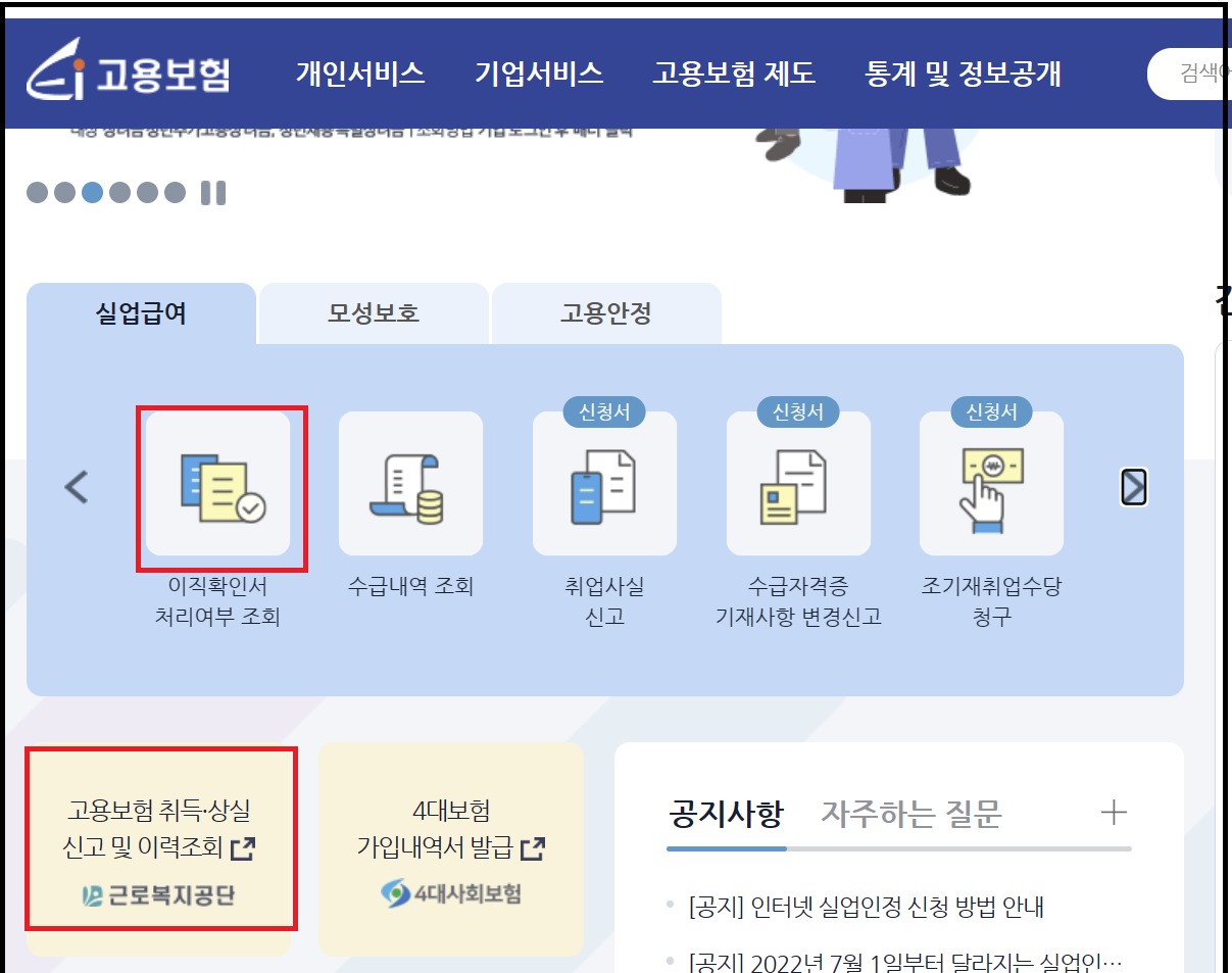 고용보험상실신고여부와 이직확인서 처리여부는 고용보험홈페이지 화면에서 확인할 수 있습니다.