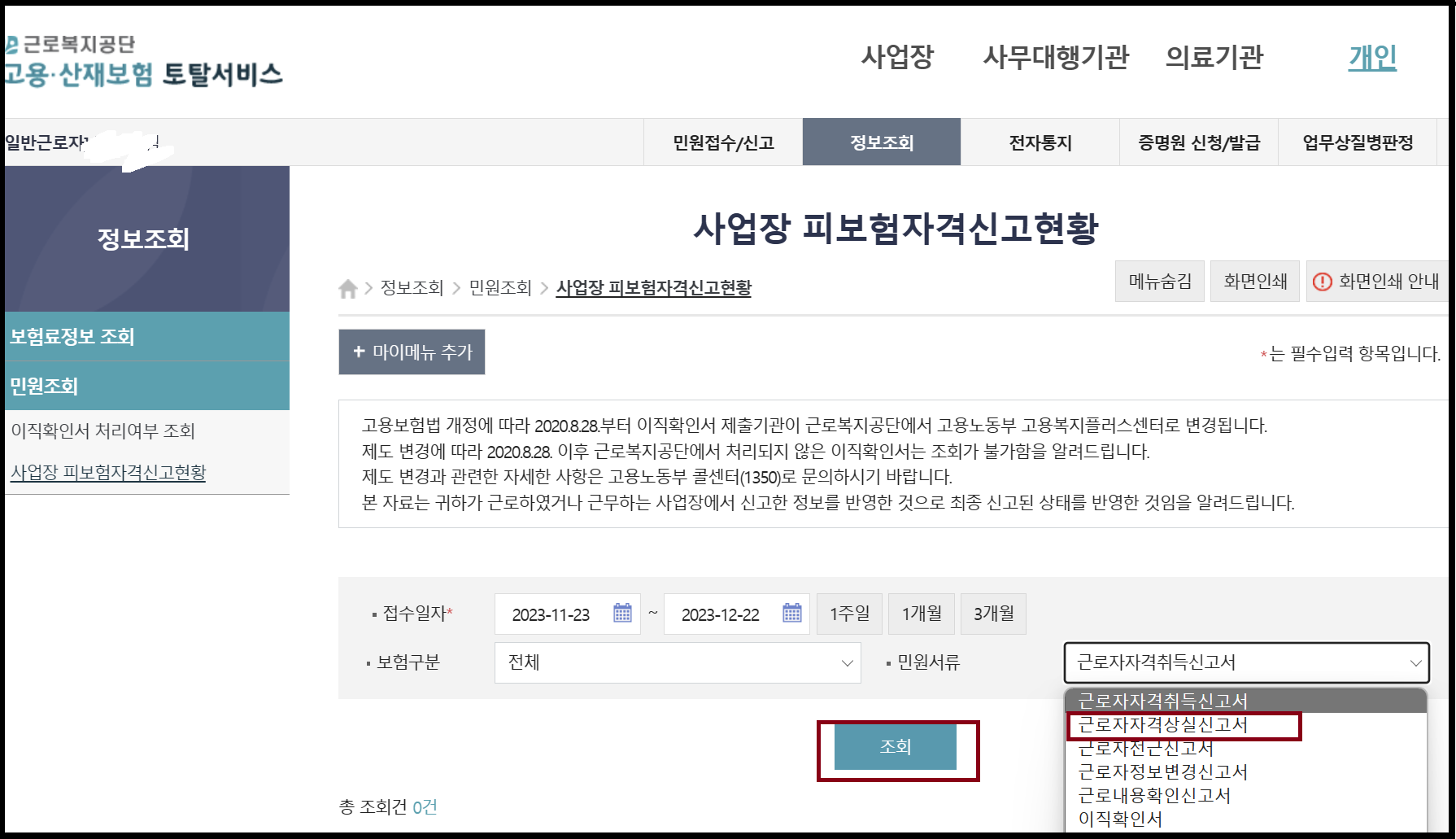 오른쪽하단에서 근로자자격상실신고서를 선택 후 조회를 클릭>>