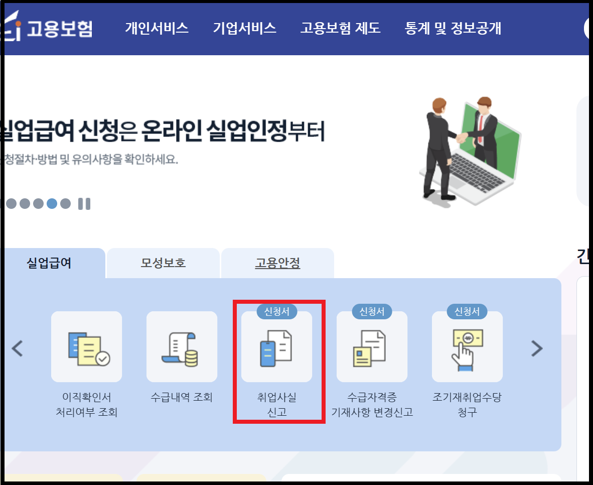 실업급여기간 중 취업이나 근로로 인한 소득발생 시에는 반드시 신고해야 하며 고용보험 홈페이지에서 신고하면 됩니다.