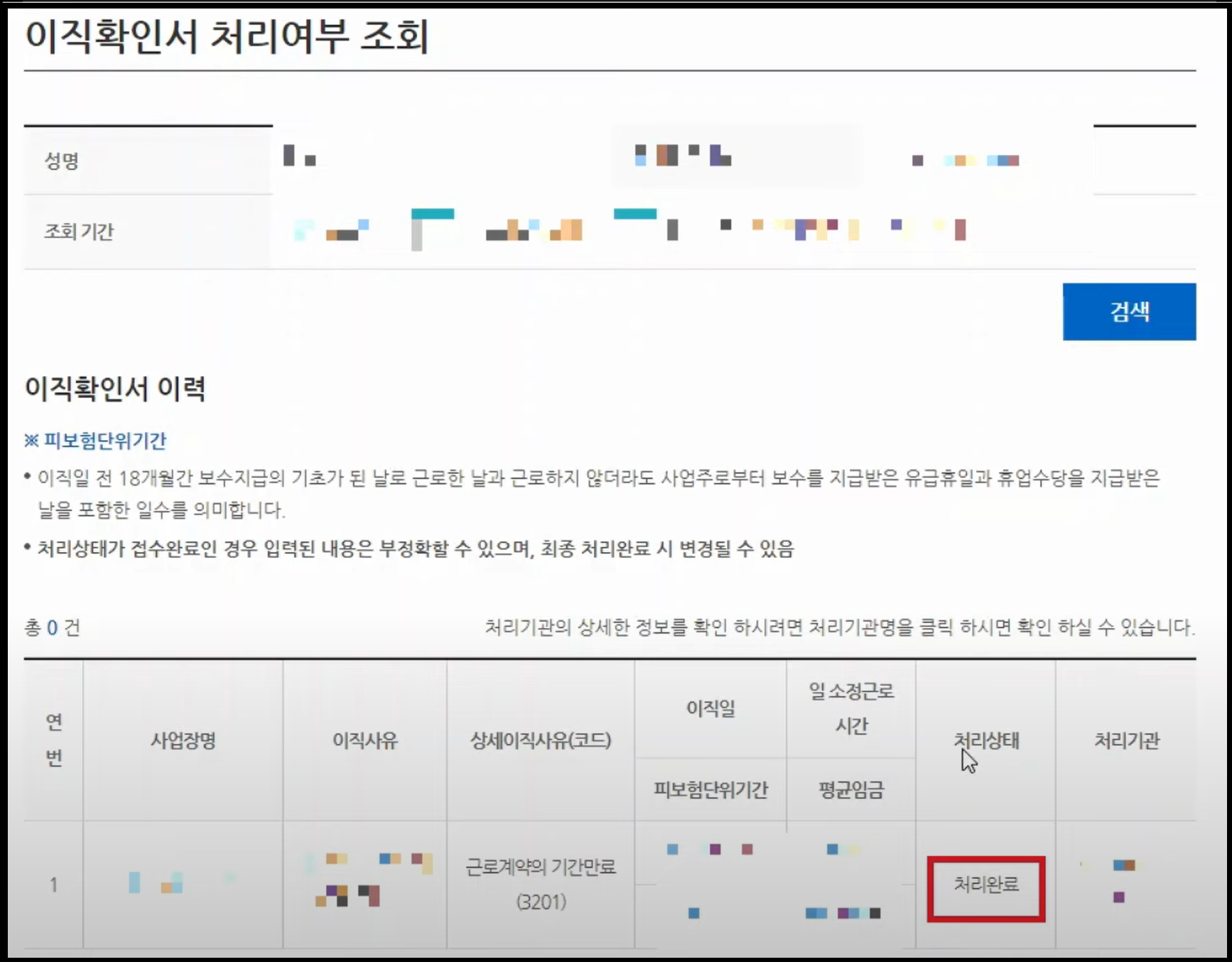 위와 같이 회사가 이직확인처리를 했다면 처리완료라고 뜹니다.