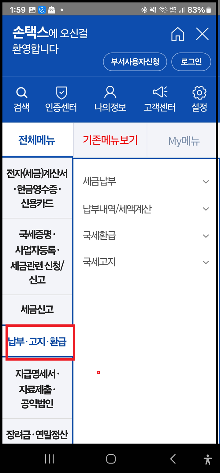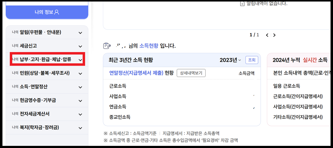 > 왼쪽 납부· 고지· 환급을 클릭합니다.