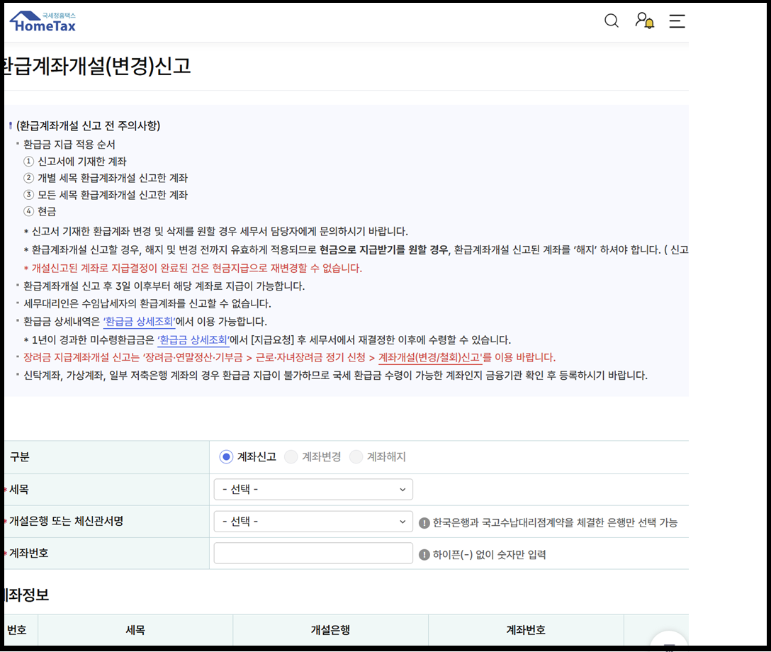 > 환급내역을 확인한 후, 환급액을 수령하기 위한 환급계좌신청을 클릭합니다.
