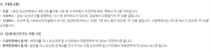 대중교통: 1호선 오산역 1번 출구에서 도보로 약 12분 거리입니다.