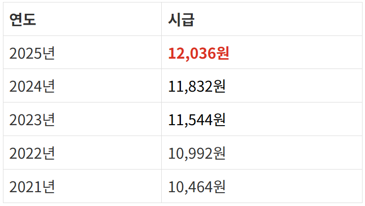 2025년의 월급은 시간당 12036원 ( 최저시급은 10030원 +주휴수당 2006원)