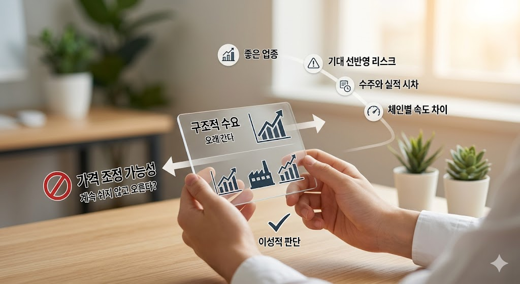 기대 선반영, 수주와 실적의 시간차, 체인별 속도 차이, 경쟁 심화를 함께 봐야 합니다.