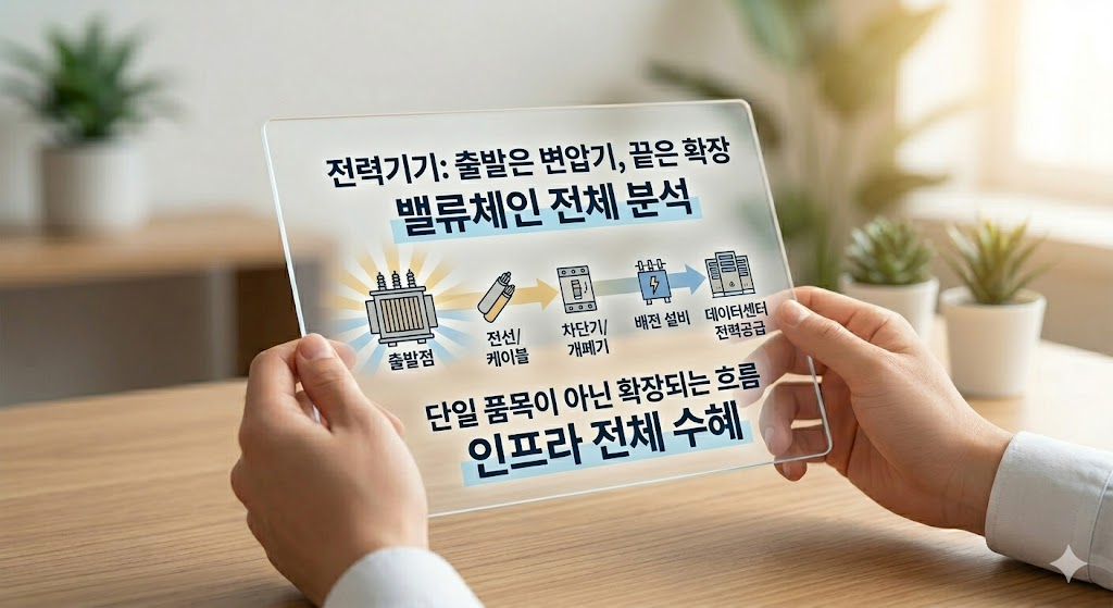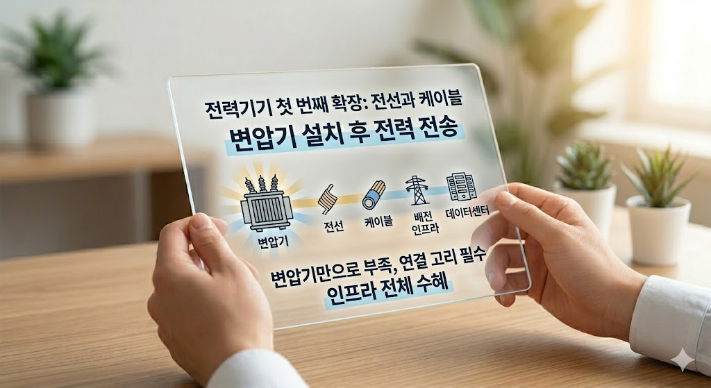 변압기만이 아니라 전선, 차단기, 배전 설비, 데이터센터 전력공급까지 이어지는 긴 체인으로 봐야 합니다.