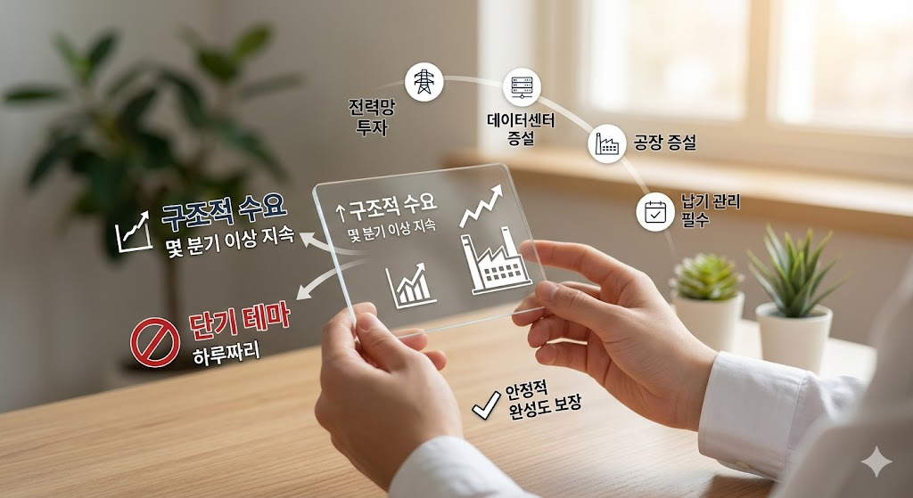 단기 테마보다 몇 분기 이상 이어질 수 있는 구조적 수요로 보되, 가격 조정 가능성도 함께 봐야 합니다.