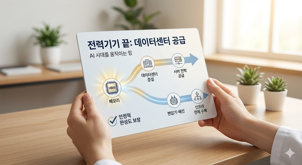 서버가 많아지면 전기를 더 많이 써야 하고, 그 전기를 안정적으로 공급할 설비가 더 필요해집니다. 그래서 지금 전력기기는 단순히 “산업재”가 아니라, AI 시대에 꼭 필요한 기반 산업으로 다시 평가받고 있습니다.