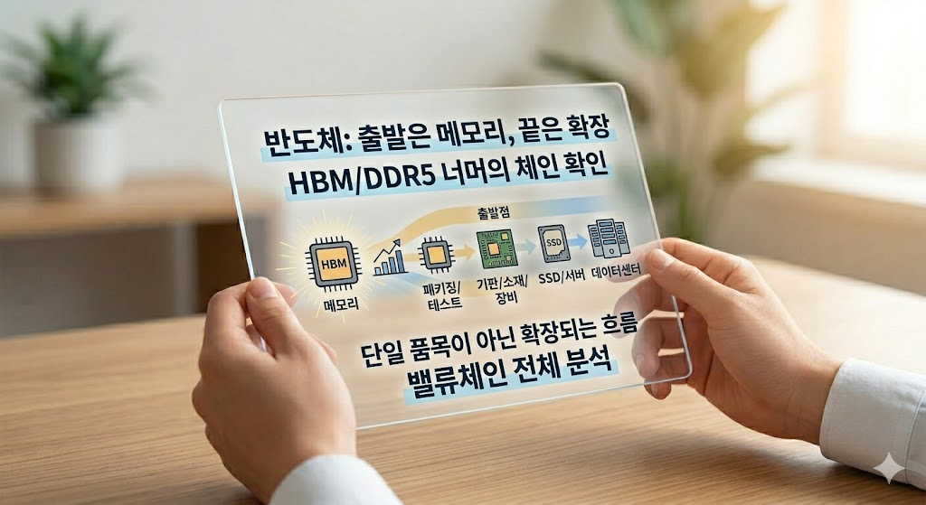 지금 반도체 흐름은 메모리 몇 종목만의 이야기가 아닙니다. HBM과 DDR5 같은 고부가 메모리에서 시작해, 패키징, 테스트, 기판, 장비, SSD, 데이터센터 인프라까지 길게 이어지는 흐름으로 봐야 더 정확합니다. 산업연구원도 2025년 하반기 전망에서 HBM·DDR5 생산 확대, AI 서버 투자 확대에 따른 SSD 수요 증가, 생산설비 고도화 투자를 함께 언급했습니다.