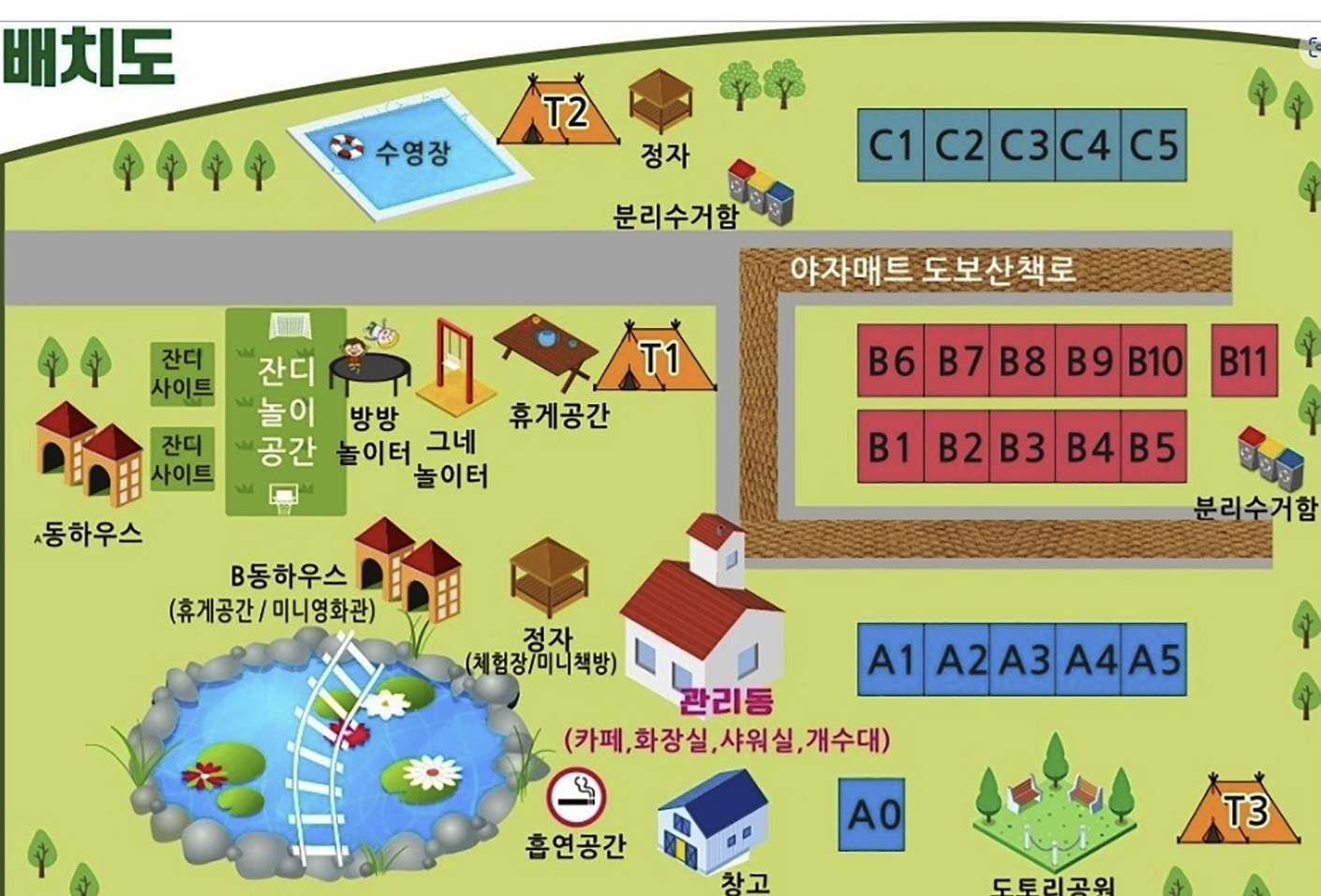 - 편의시설 – 화장실, 샤워장, 개수대, 매점 등 기본 시설 상태