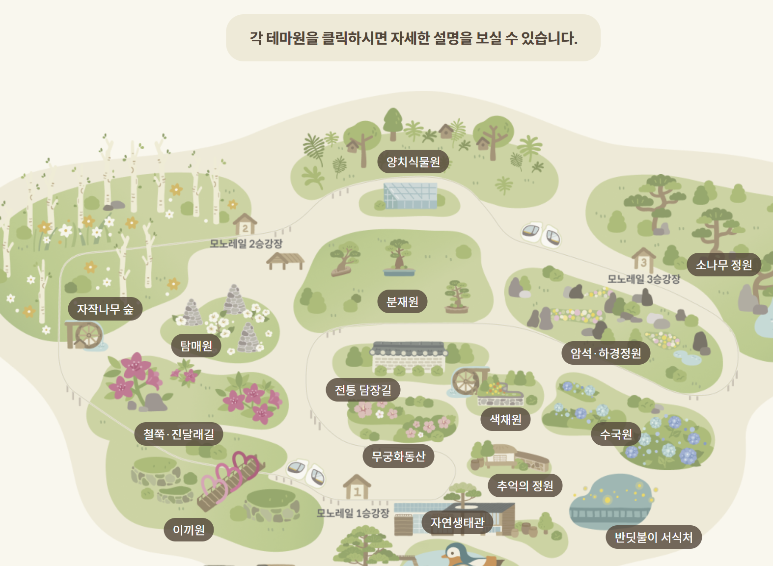 ▪️단풍원: 가을철 가장 인기 있는 코스로, 국내외 다양한 단풍나무 품종을 감상할 수 있음