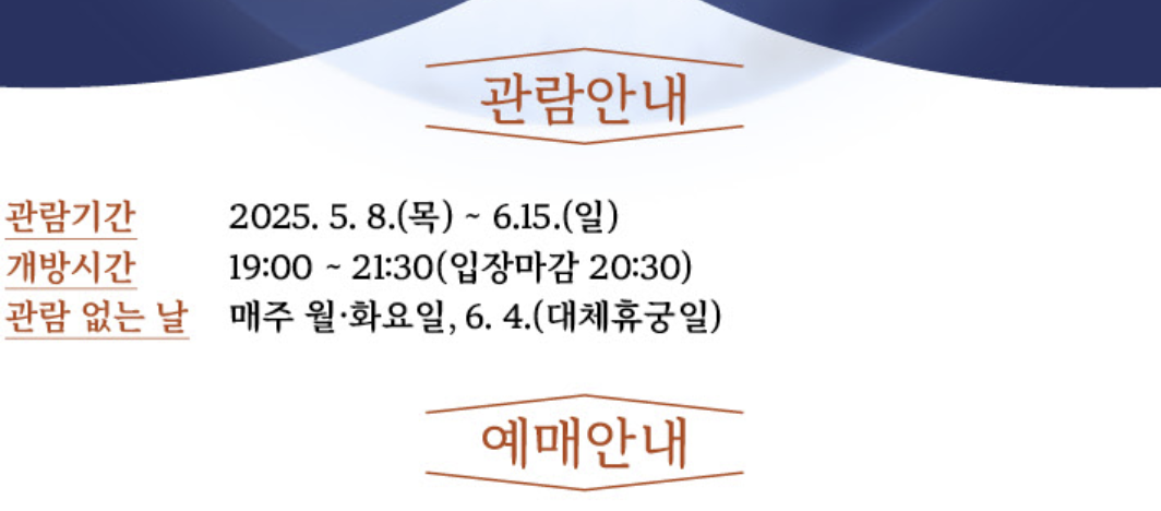 | 관람 시간 | 19:00 ~ 21:30 (입장 마감 20:30) |