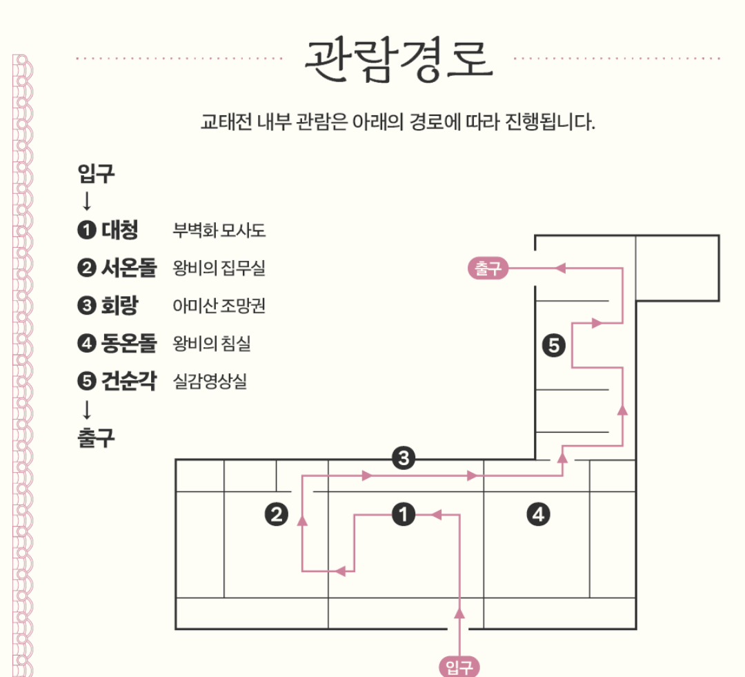 - 일부 구역은 안내자의 동선에 따라 관람해야 함