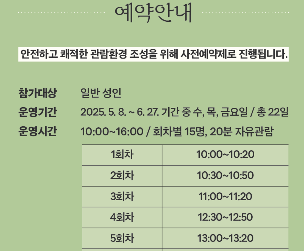 | 관람 방식 | 예약제, 회당 15명 소규모 |