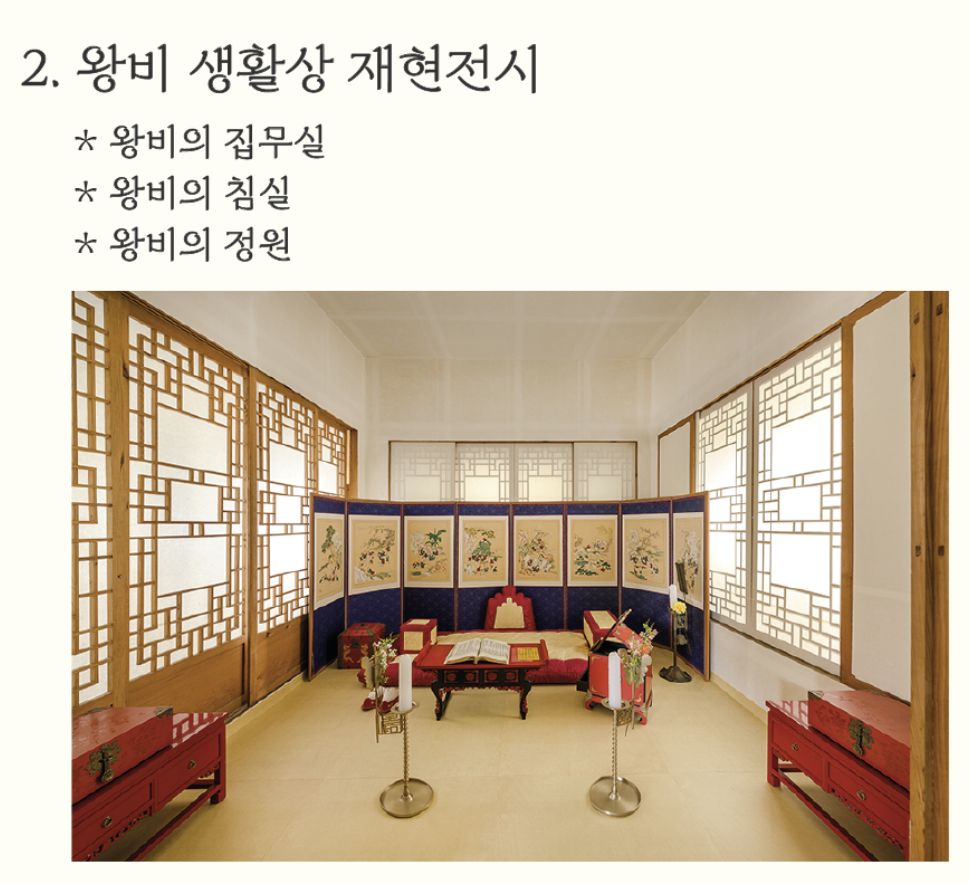 | 온돌방 | ✅ 가능 | 왕비의 생활 재현 유물 전시 |