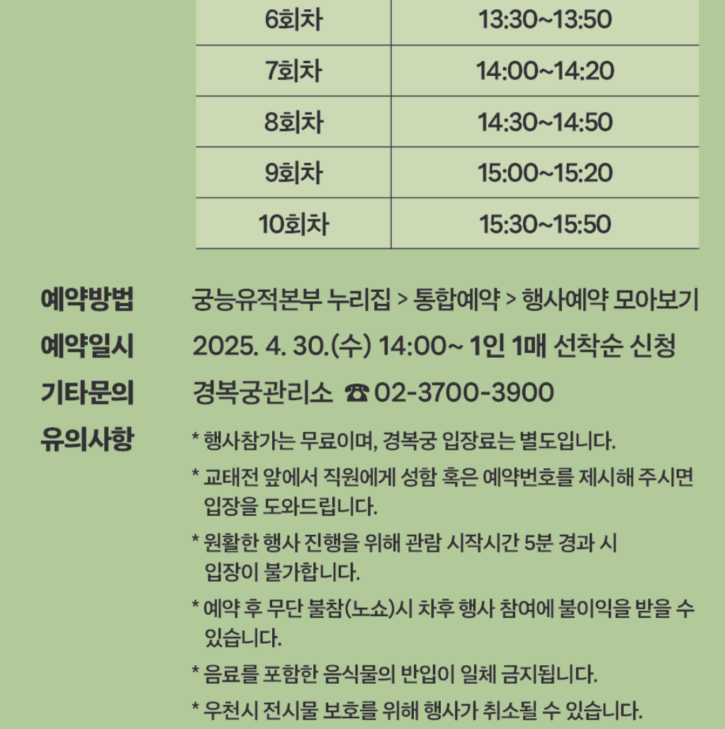 **궁능유적본부 누리집**에서 선착순으로 예약할 수 있습니다.