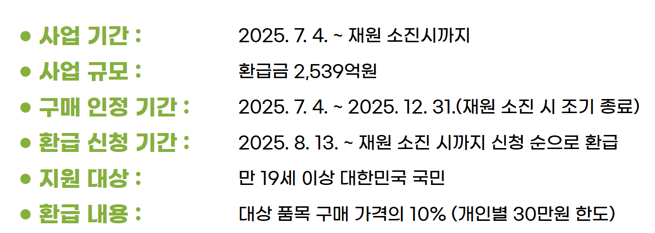 만 19세 이상 대한민국 국민이 TV, 냉장고, 세탁기 등 11개 품목의 최상위 효율 등급 가전제품을 구매할 경우, 구매비용의 10%(개인별 30만원 한도)를 환급해드립니다.