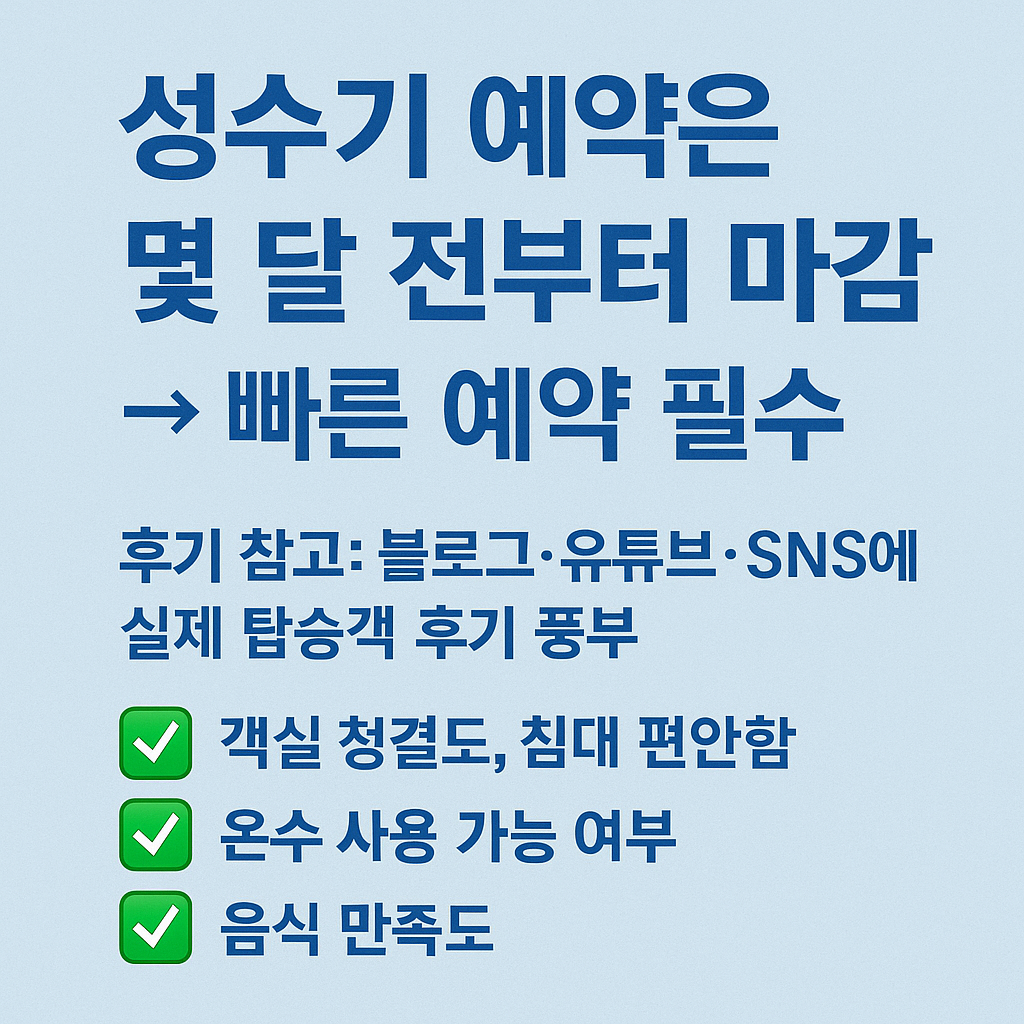 - 성수기 예약은 몇 달 전부터 마감 → 빠른 예약 필수