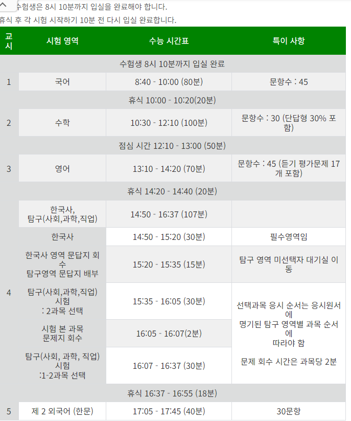 2024년도 수능날짜와 시간표