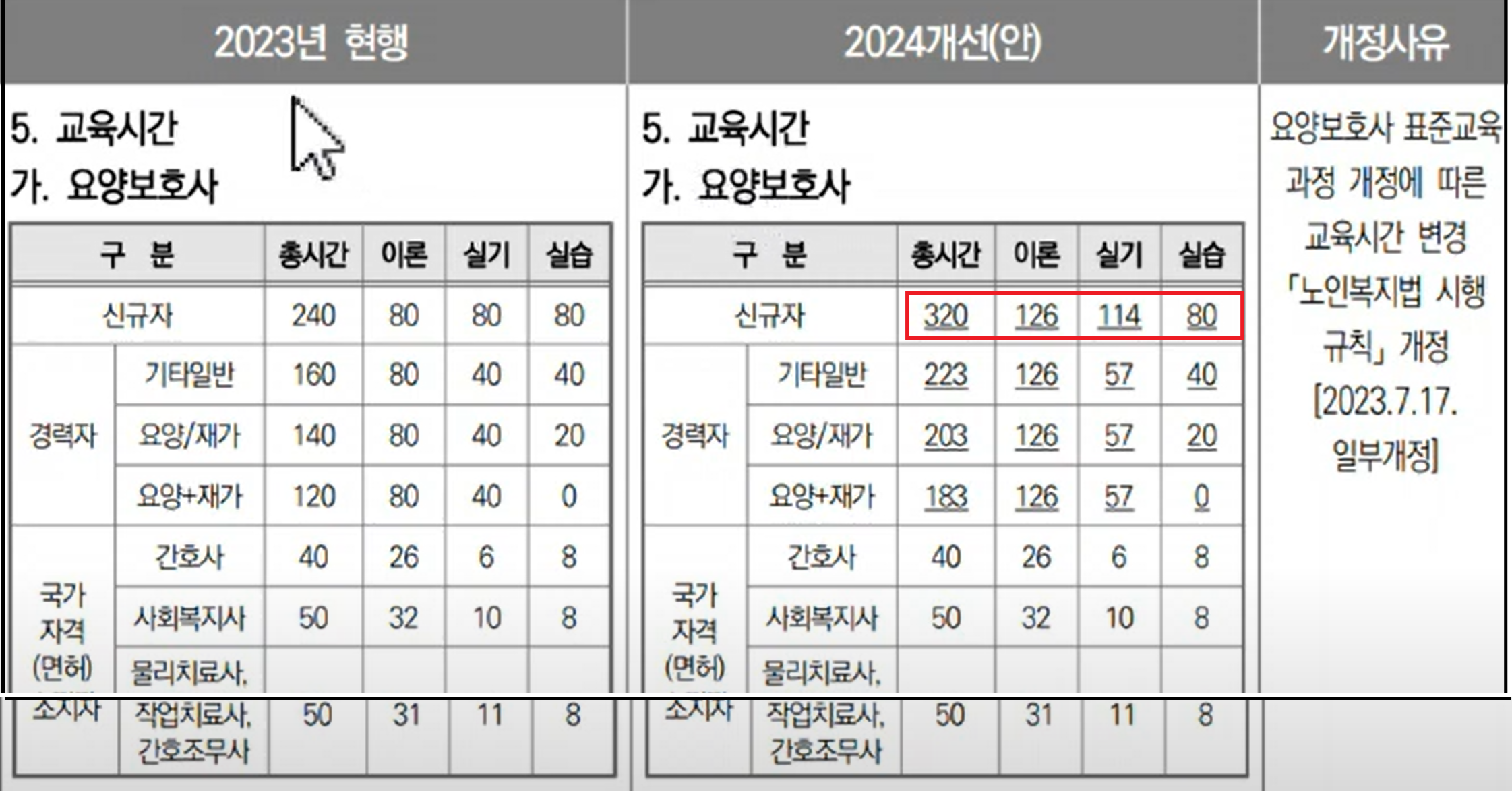 신규자와 경력자의 경우 교육과정시간이 늘어났습니다. 이론 46시간 추가. 실기 34시간 추가. 현장실습시간은 동일.